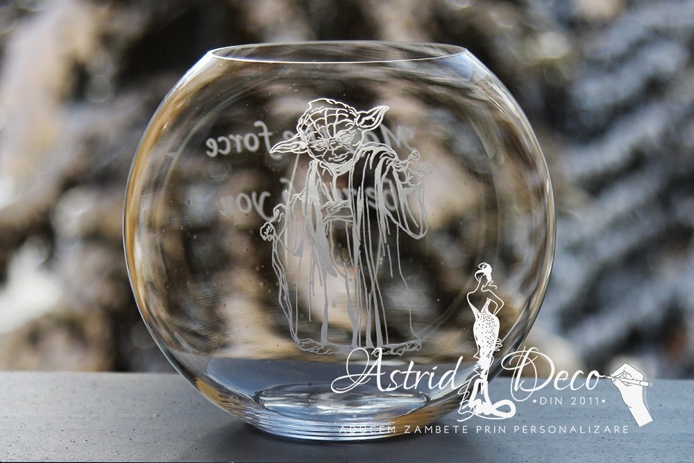 Bol de sticla gravat manual - model Yoda pe o parte - text: May the force be with you - pe cealalta parte