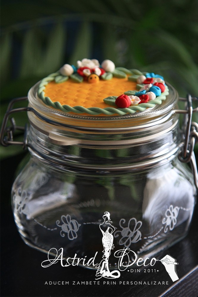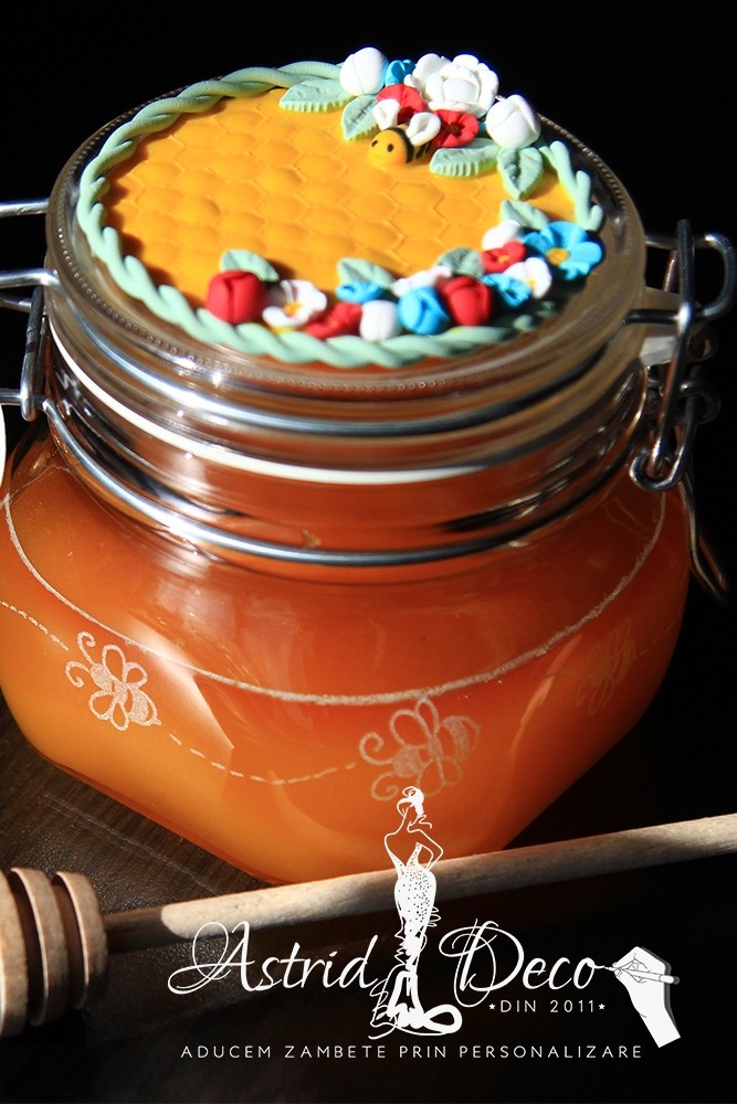 - Capacul decorat cu lut polimeric, cu fagure, floricele si albinuta