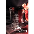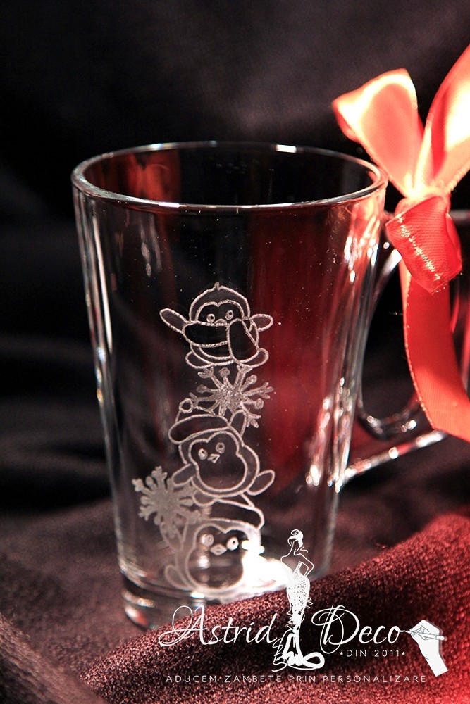 Cana de sticla, gravata manual cu model 3 pinguini unul peste altul si model fulgi