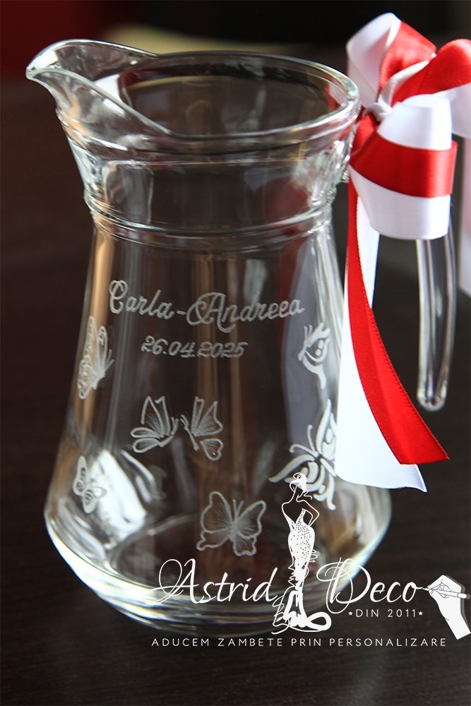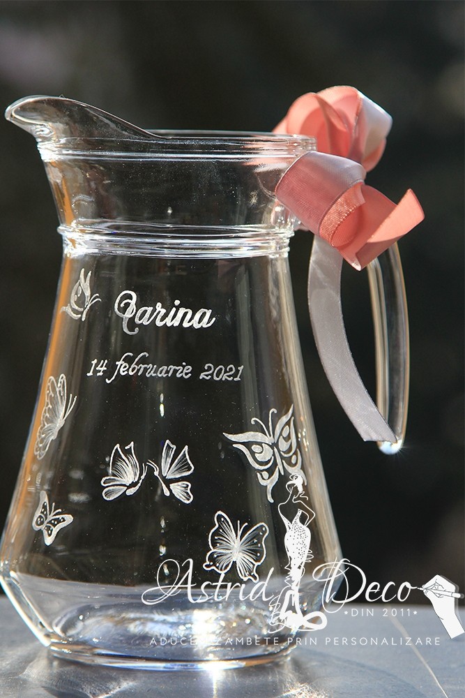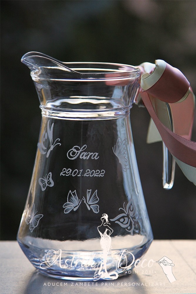 Carafa de sticla, gravata manual cu model fluturi, personalizata cu nume si data