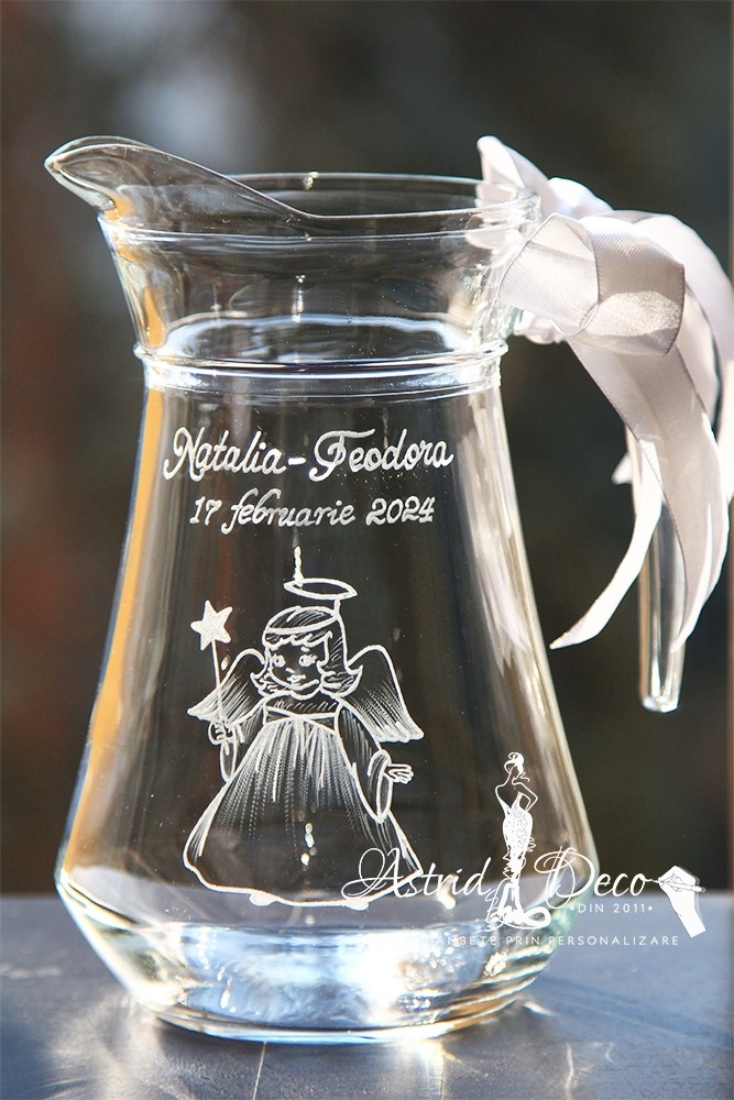 Carafa de sticla, gravata manual cu model Ingeras si personalizata cu nume si data