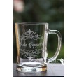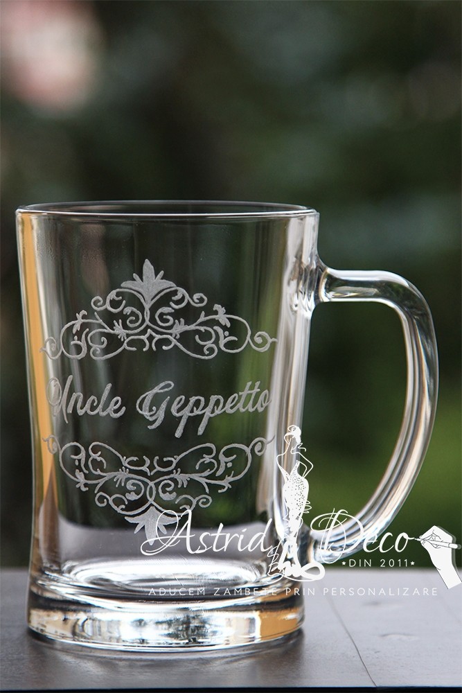 Halba de sticla, gravata manual cu un model de bordura si personalizata cu nume.