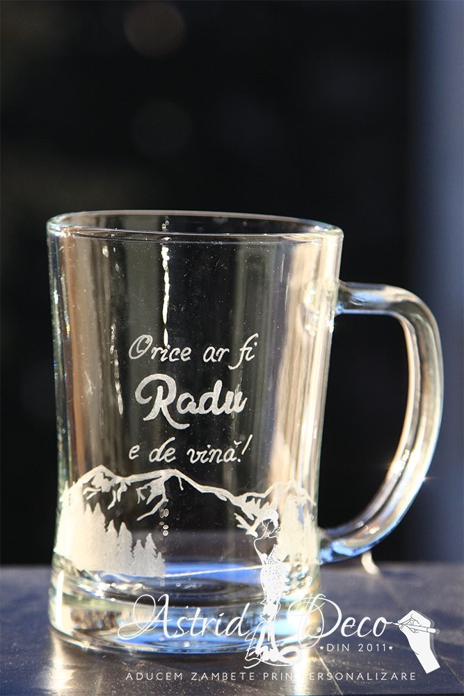 Halba de bere, gravata manual cu model munti si brazi
