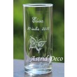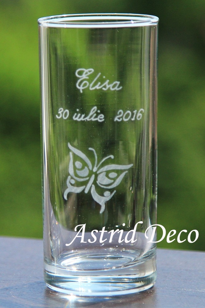 Pahar de sticla, apa/ suc, gravat manual cu nume si model fluture
