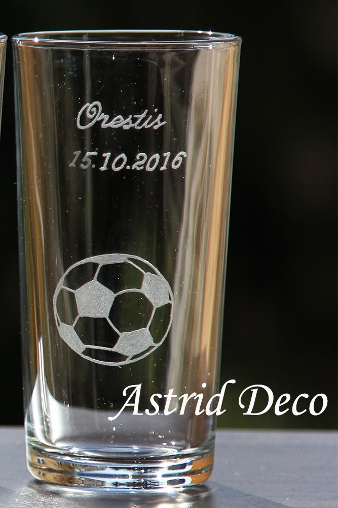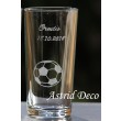Pahar de sticla, apa/ suc, gravat manual cu nume si model minge de fotbal