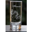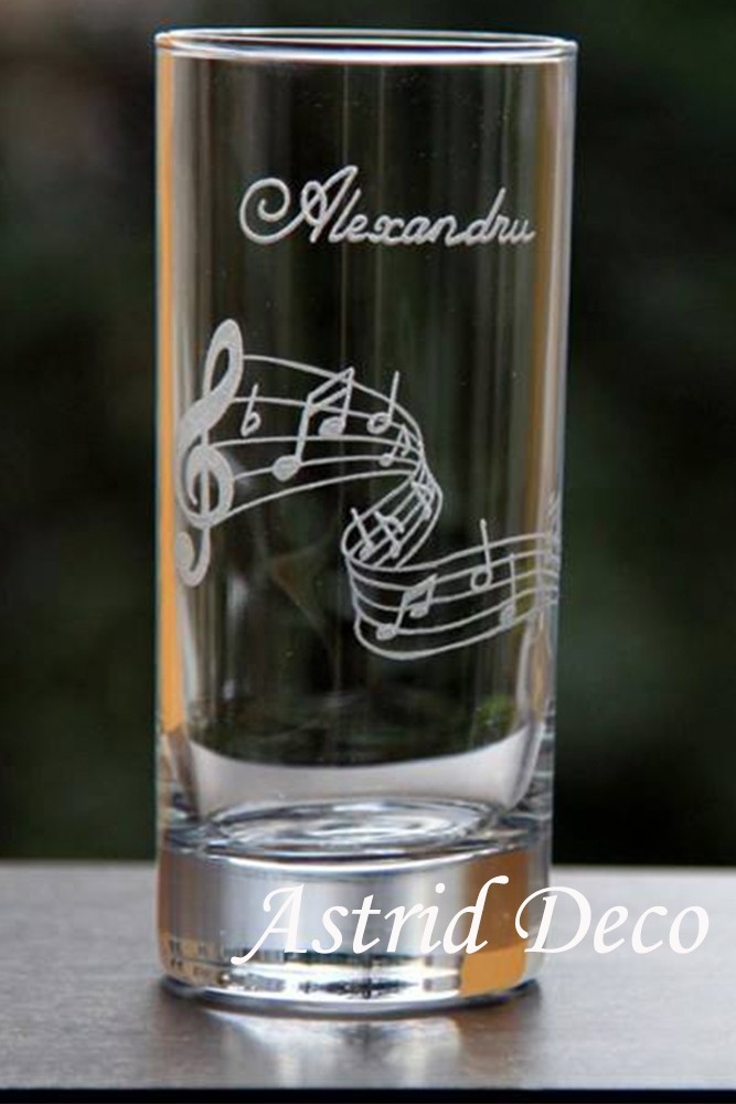 Pahar de sticla, apa/ suc, gravat manual cu nume si model portativ cu note muzicale