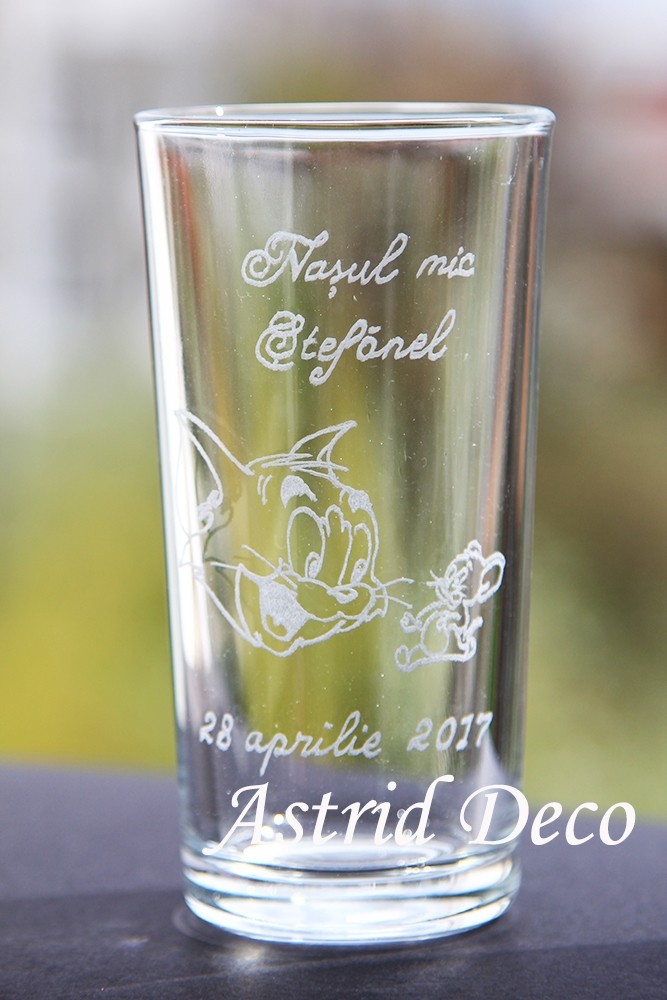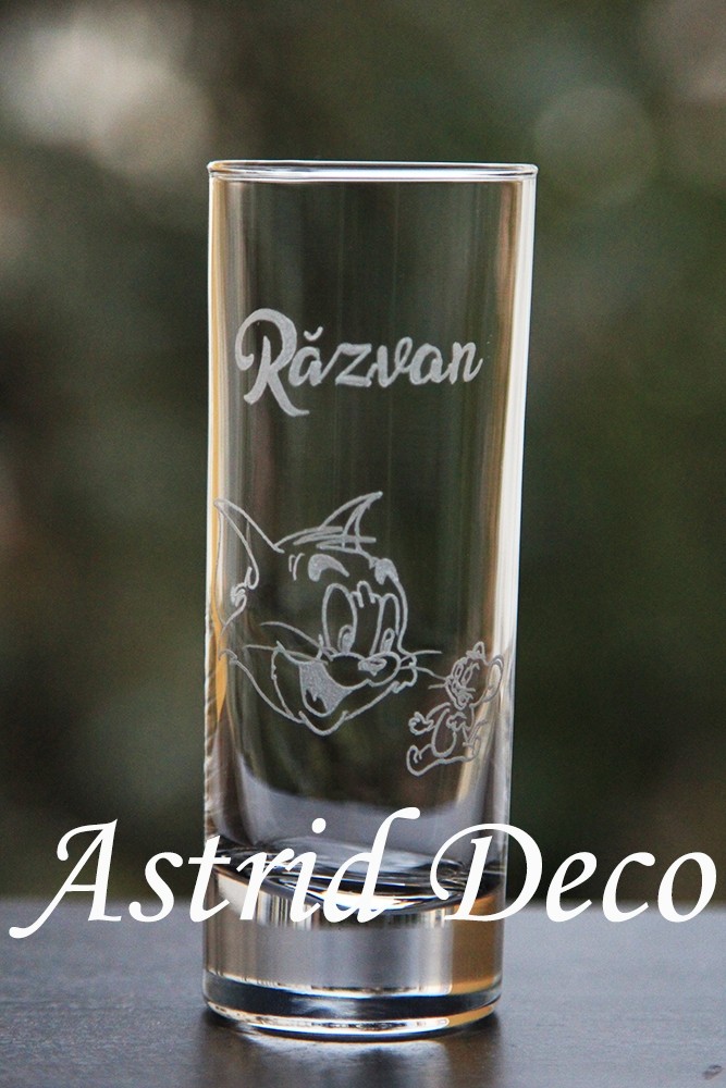 Pahar de sticla, apa/ suc, gravat manual cu nume si model Tom & Jerry