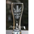 Pahar de sticla, de bere, gravat manual cu model de o sticla de bere, cu spic de grau si panglica cu text (nume)'s beer