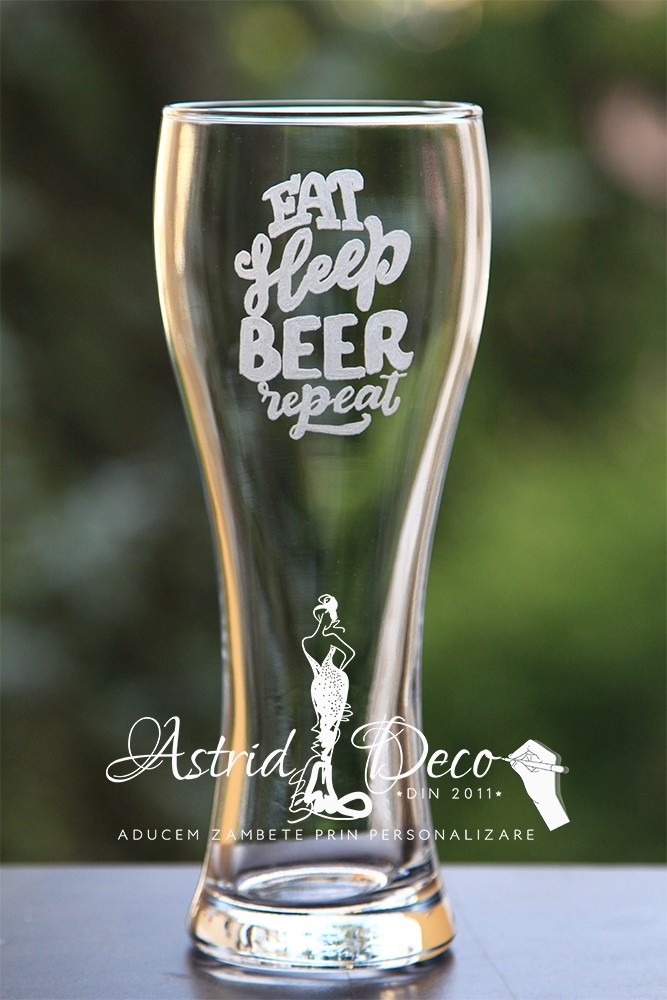 Pahar de sticla, pentru bere, gravat manual cu text Eat Sleep Beer Repeat