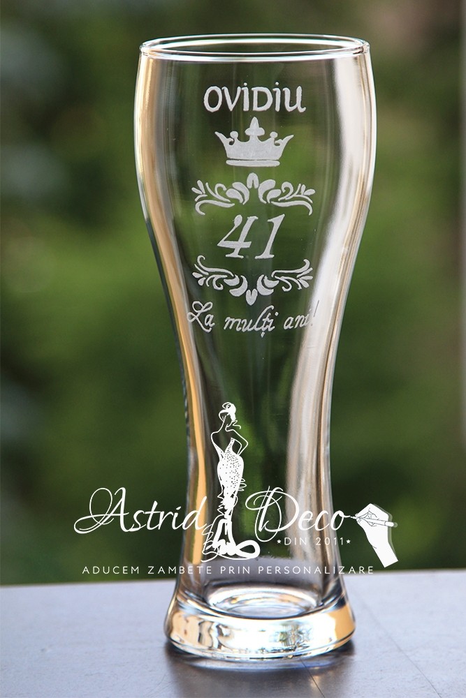 Pahar de sticla, pentru bere, gravat manual cu model coronita, cifra aniversara si text