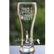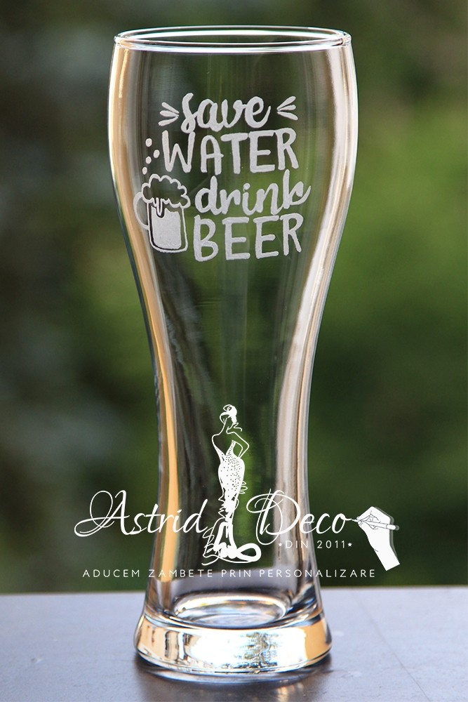 Pahar de sticla, pentru bere, gravat manual cu model halba si text Save water Drink beer