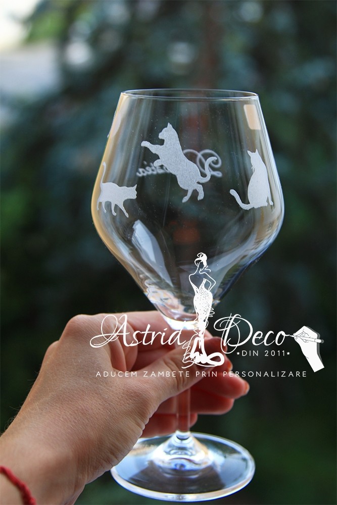 Pahar Bohemia, de vin, gravat manual cu model pisici