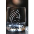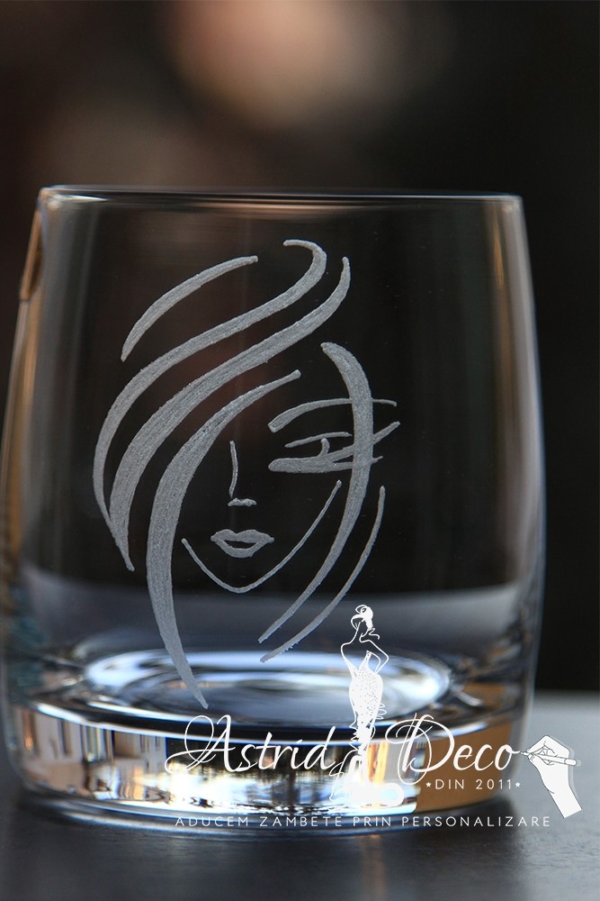 Pahar Bohemia de whiskey, gravat manual cu model de silueta femeie tunsa bob