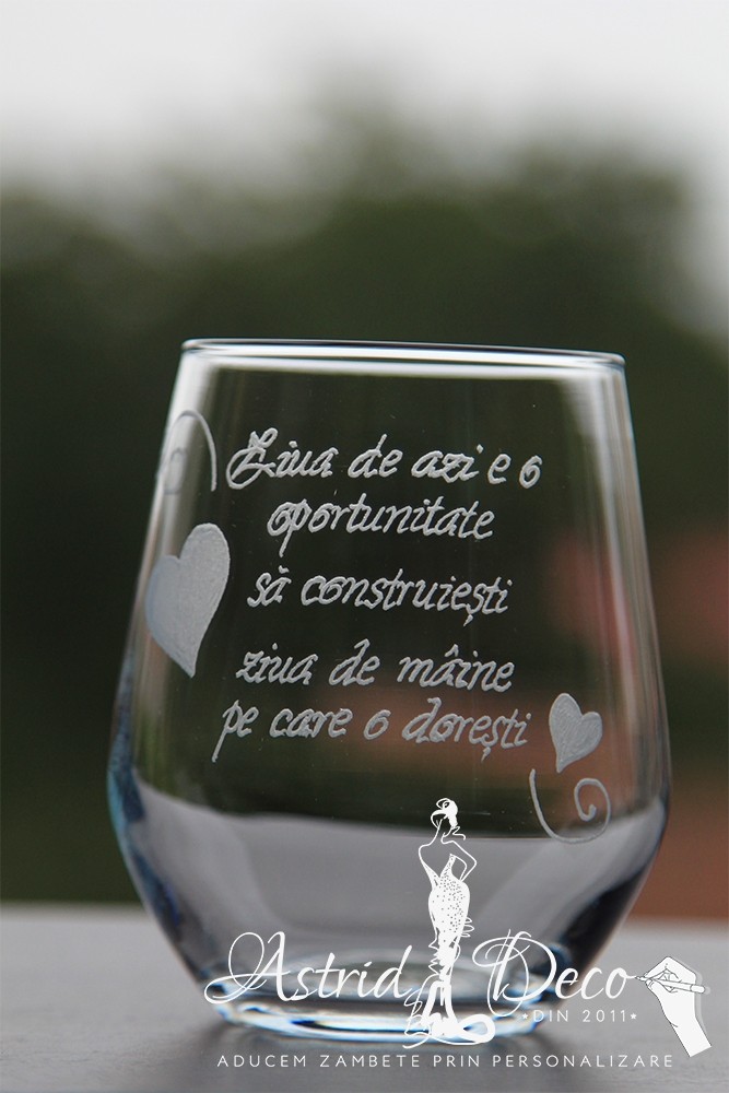 Pahar de sticla, gravat manual cu model si mesaj motivational :