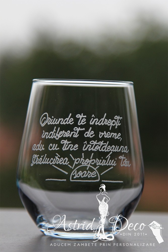 Pahar de sticla, gravat manual cu model si mesaj motivational :