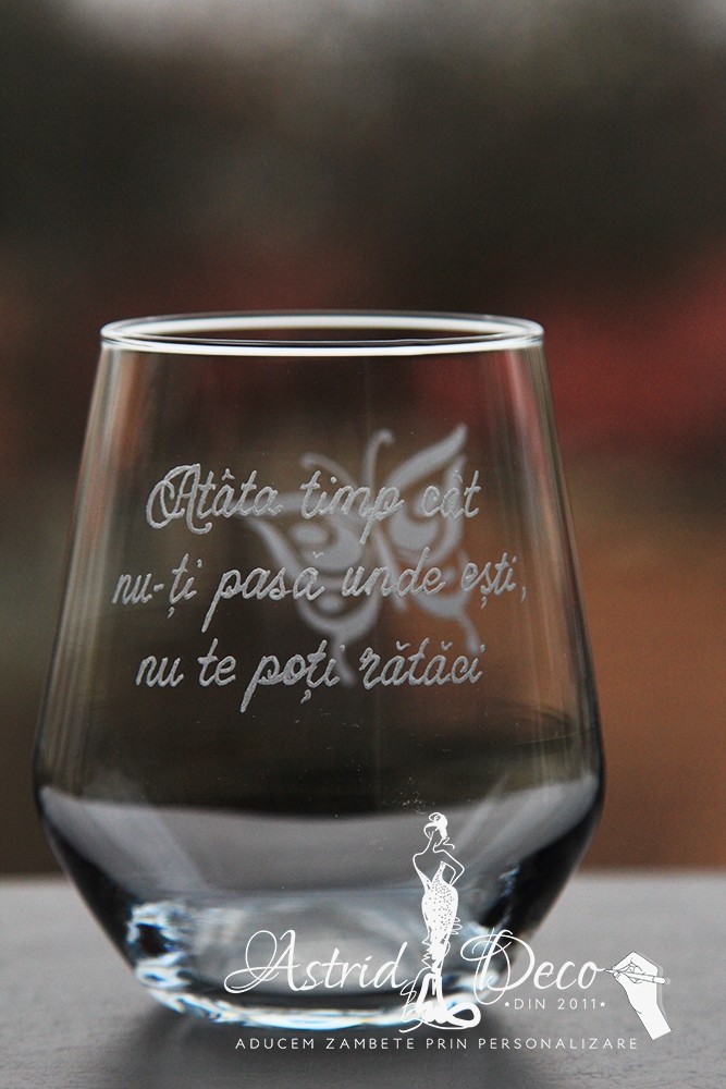 Pahar de sticla, gravat manual cu model si mesaj motivational :