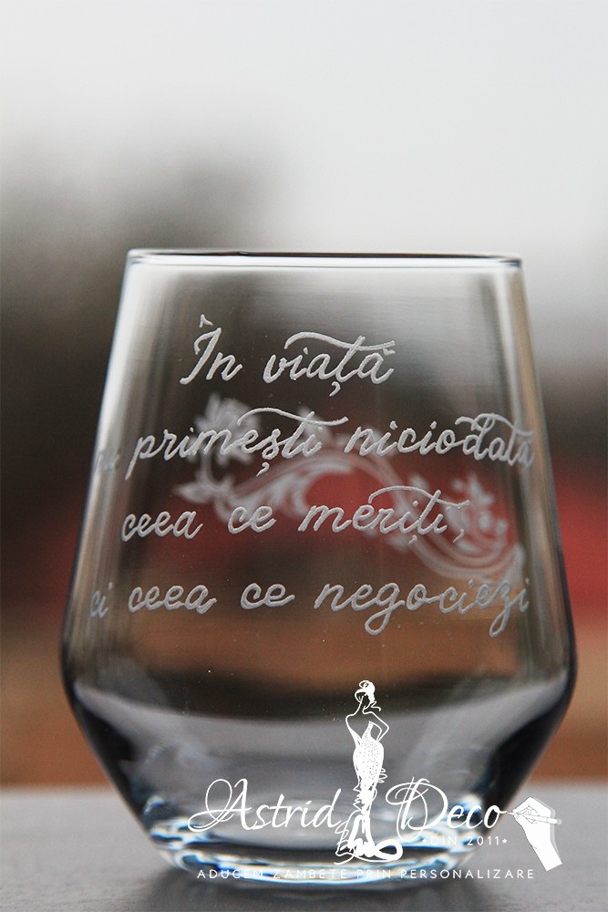 Pahar de sticla, gravat manual cu model si mesaj motivational :
