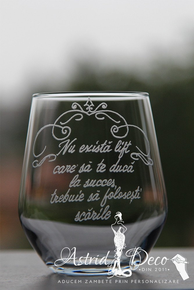 Pahar de sticla, gravat manual cu model si mesaj motivational :