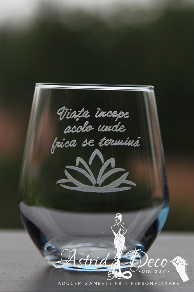 Pahar de sticla, gravat manual cu model si mesaj motivational :