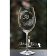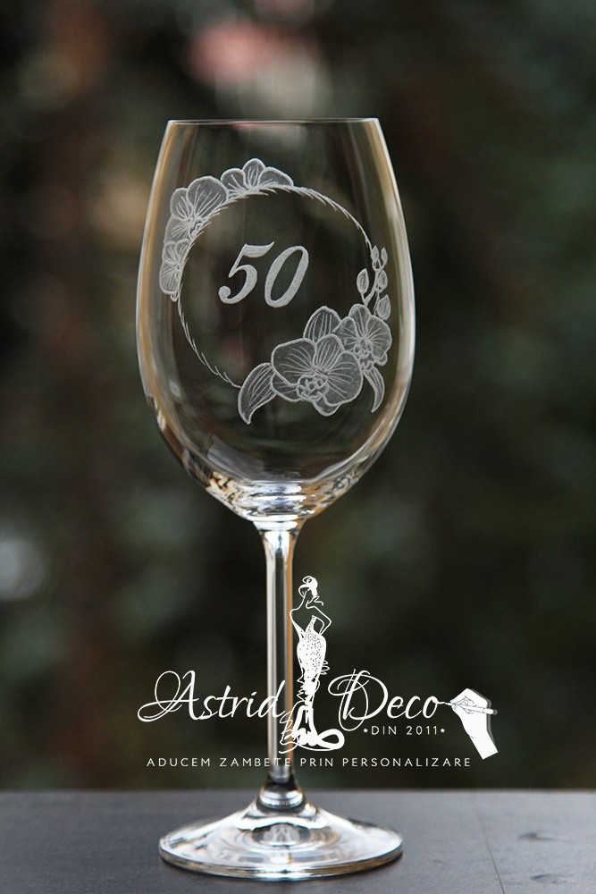 Pahar de vin, Bohemia, gravat manual cu model orhidee si cifra aniversara