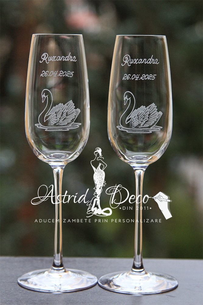 Set 2 pahare de sampanie, personalizate cu numele copilului, data si model lebada