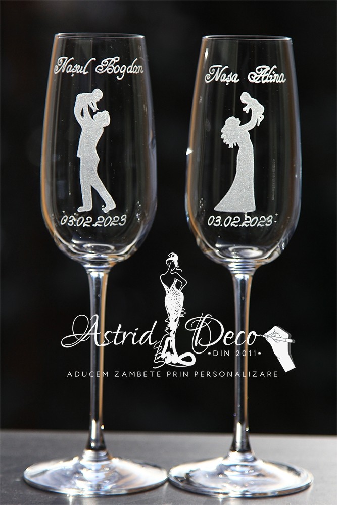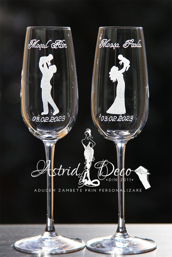 Set format din 2 pahare de sampanie, gravate manual cu model siluete cu copil