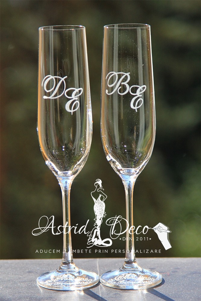 Set 2 pahare Bohemia de sampanie, gravate manual cu initialele mirilor si data nuntii pe talpa paharului