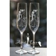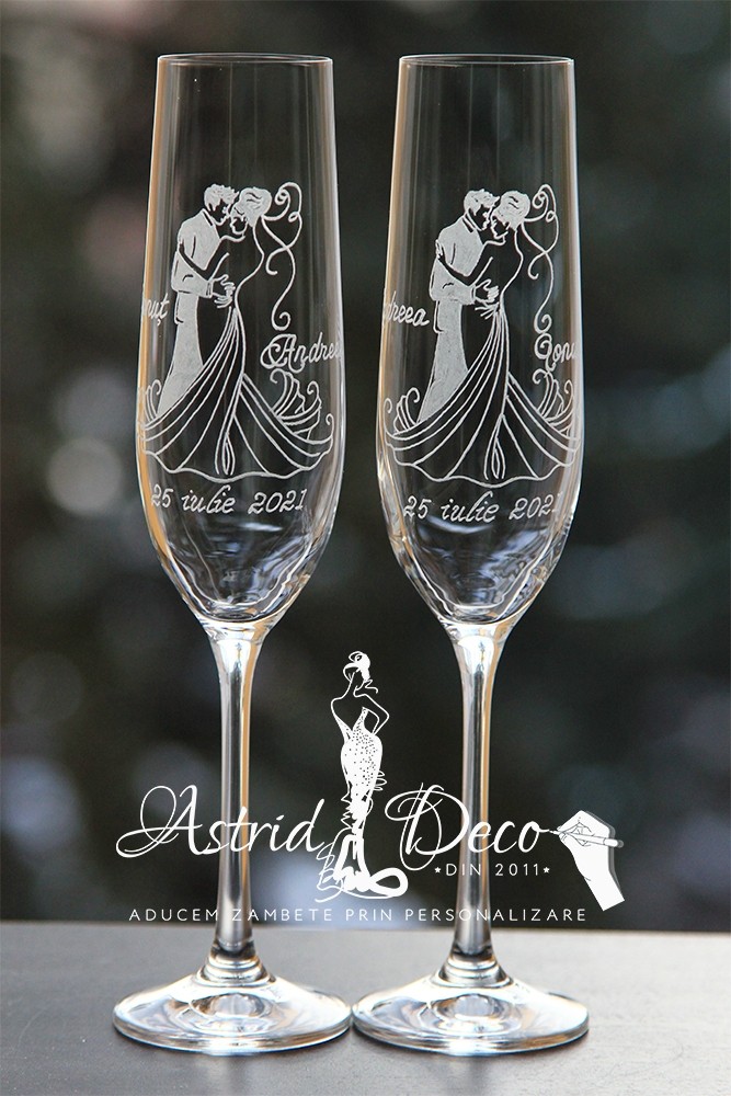 Set de 2 pahare de sampanie Bohemia, gravate manual cu model siluete miri, nume si data nuntii