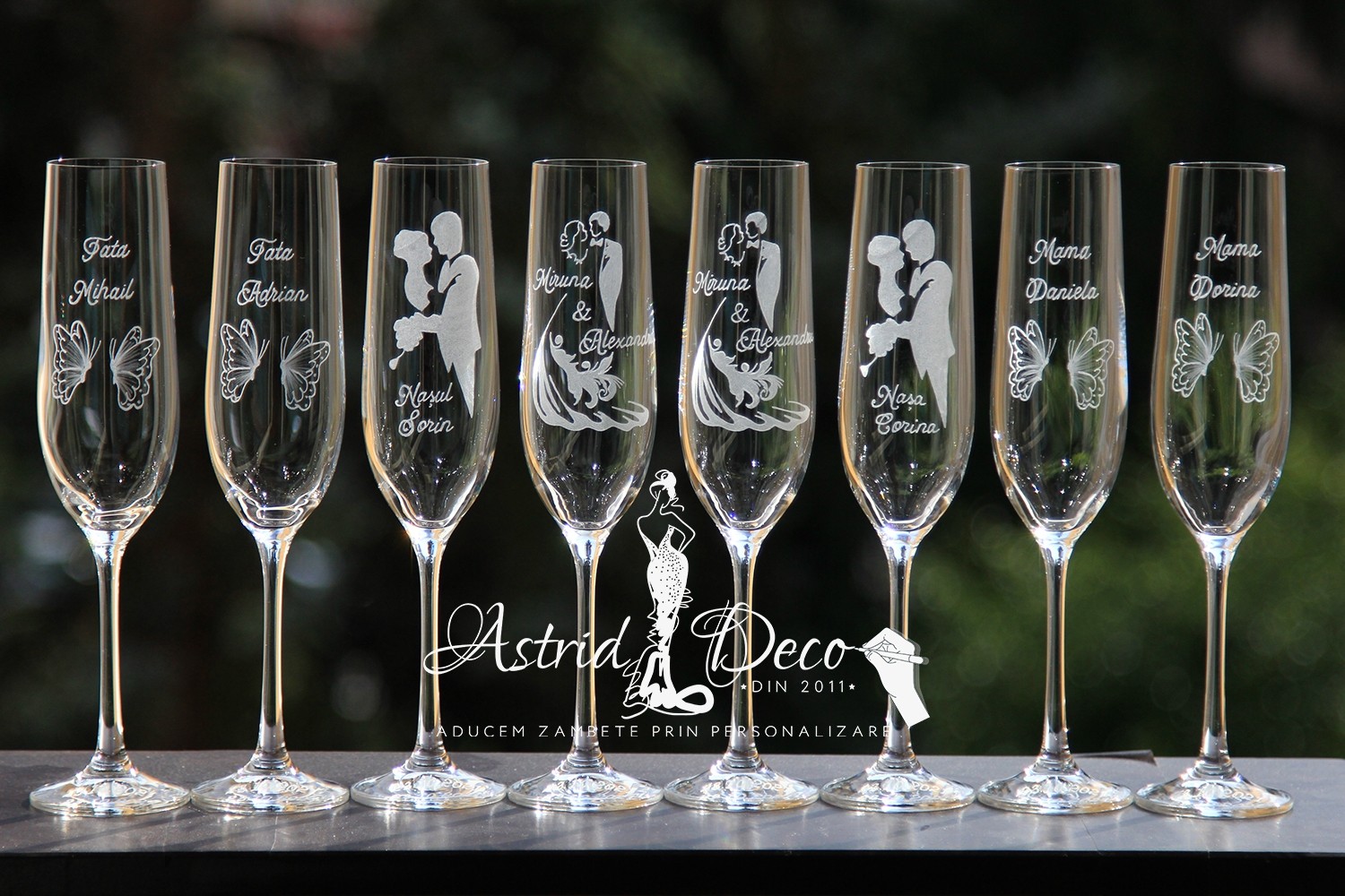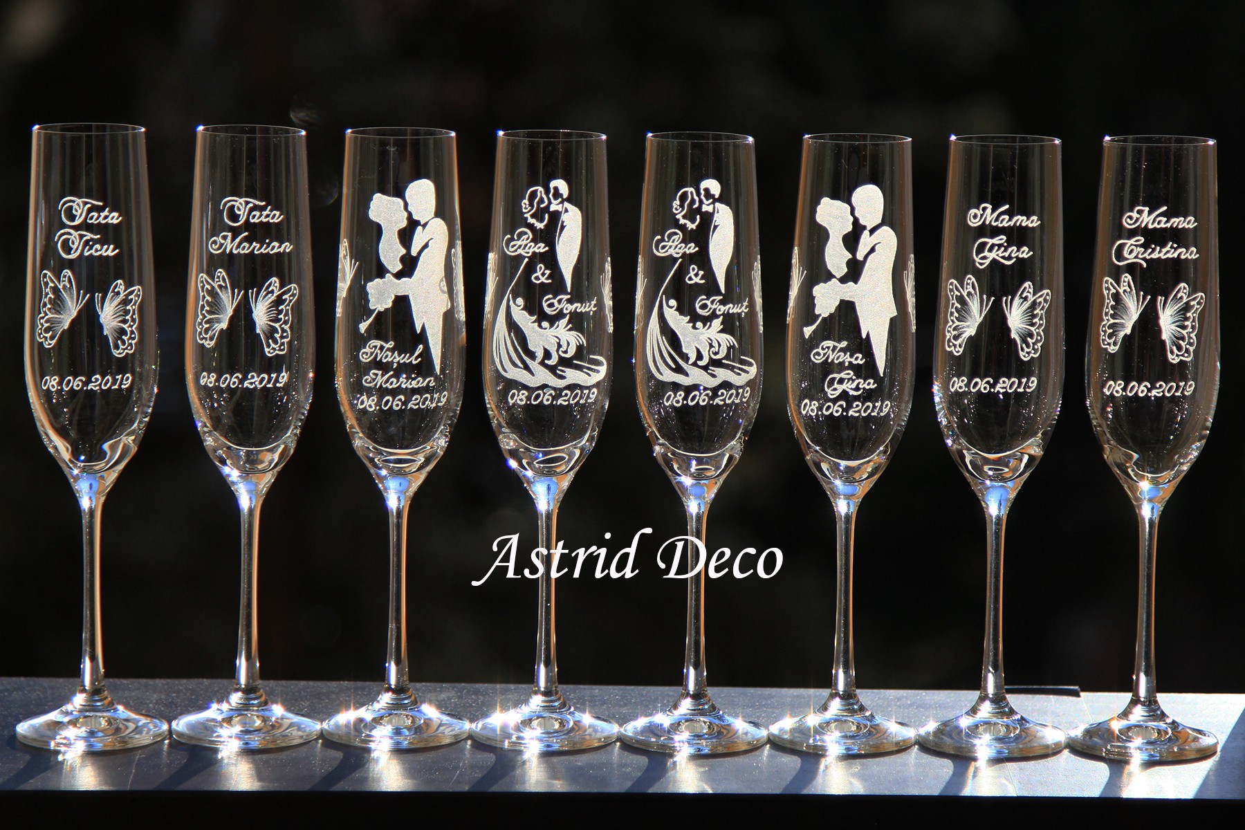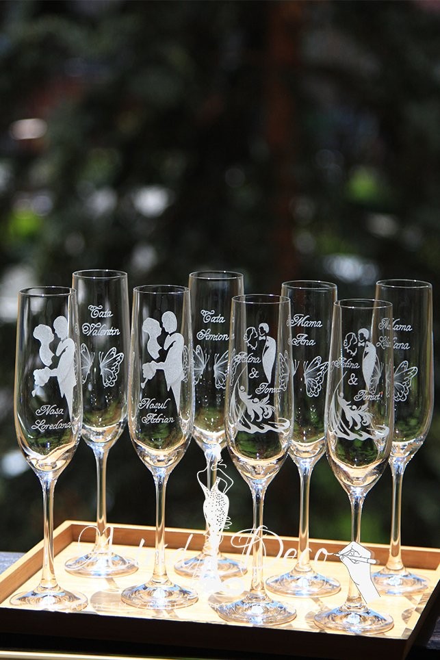 Set format din 8 pahare Bohemia, de sampanie, pentru miri, nasi si parinti, gravate manual