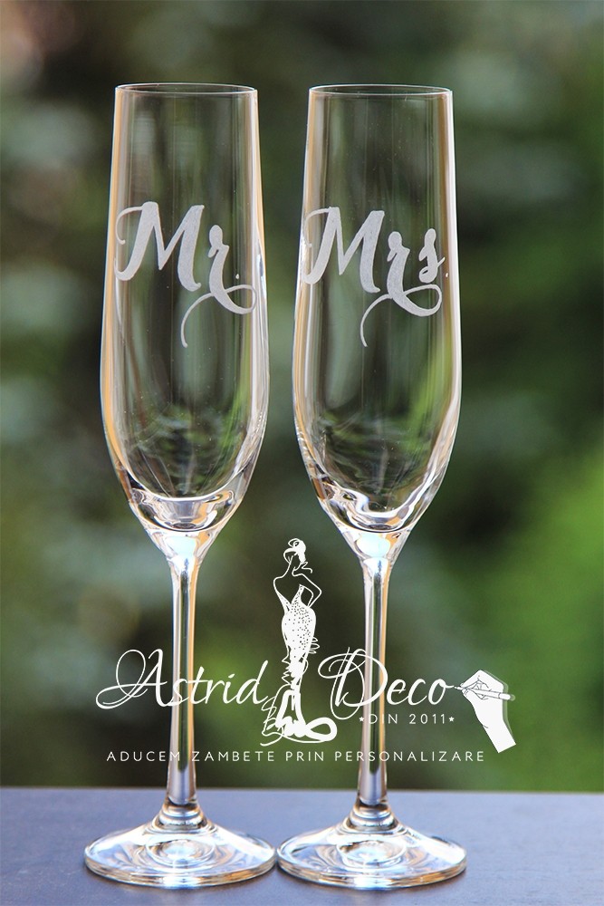 Set format din 2 pahare Bohemia de sampanie, gravate cu Mr/ Mrs pentru miri.