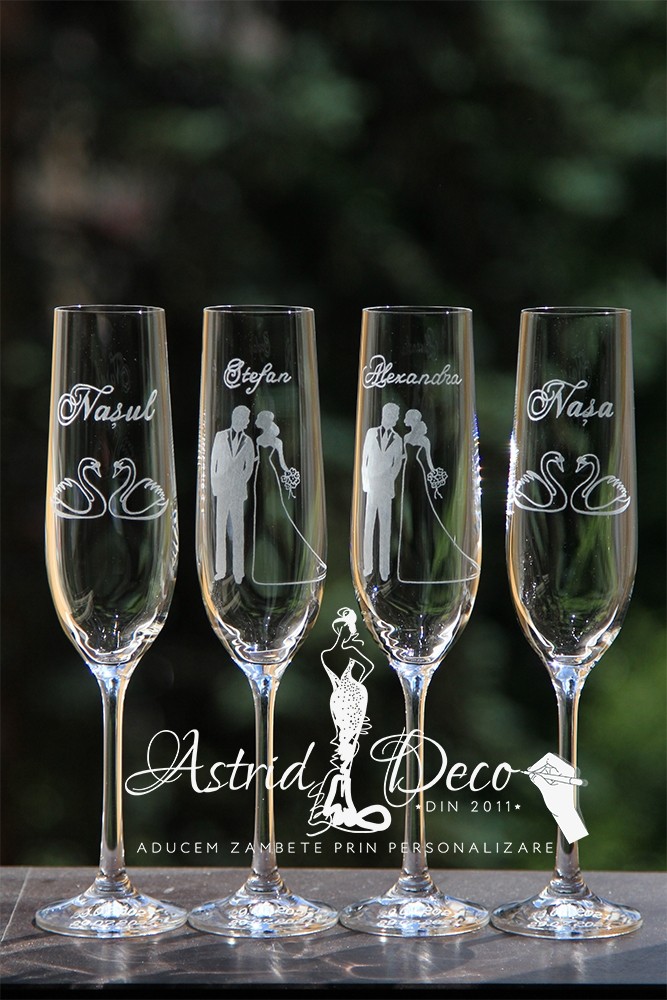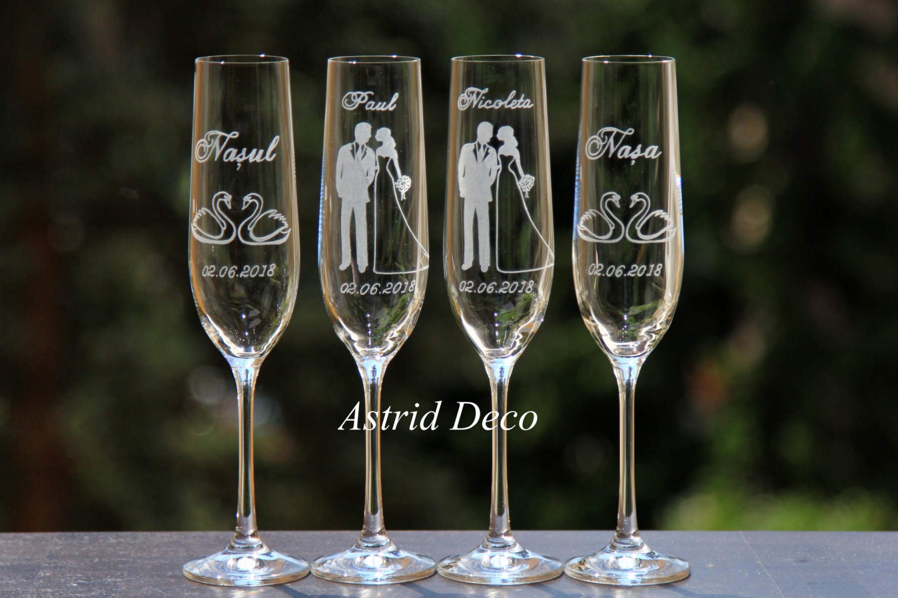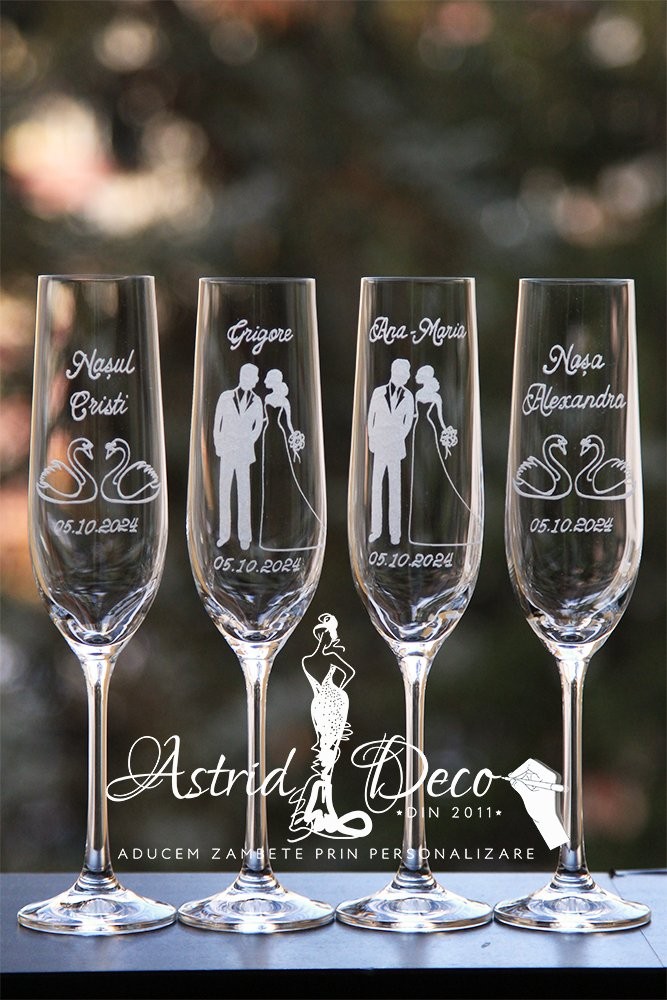 Set format din 4 pahare Bohemia, de sampanie, miri si nasi, gravate manual