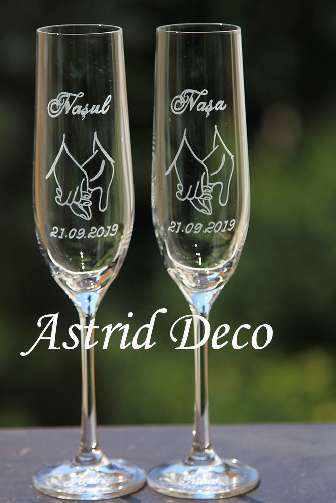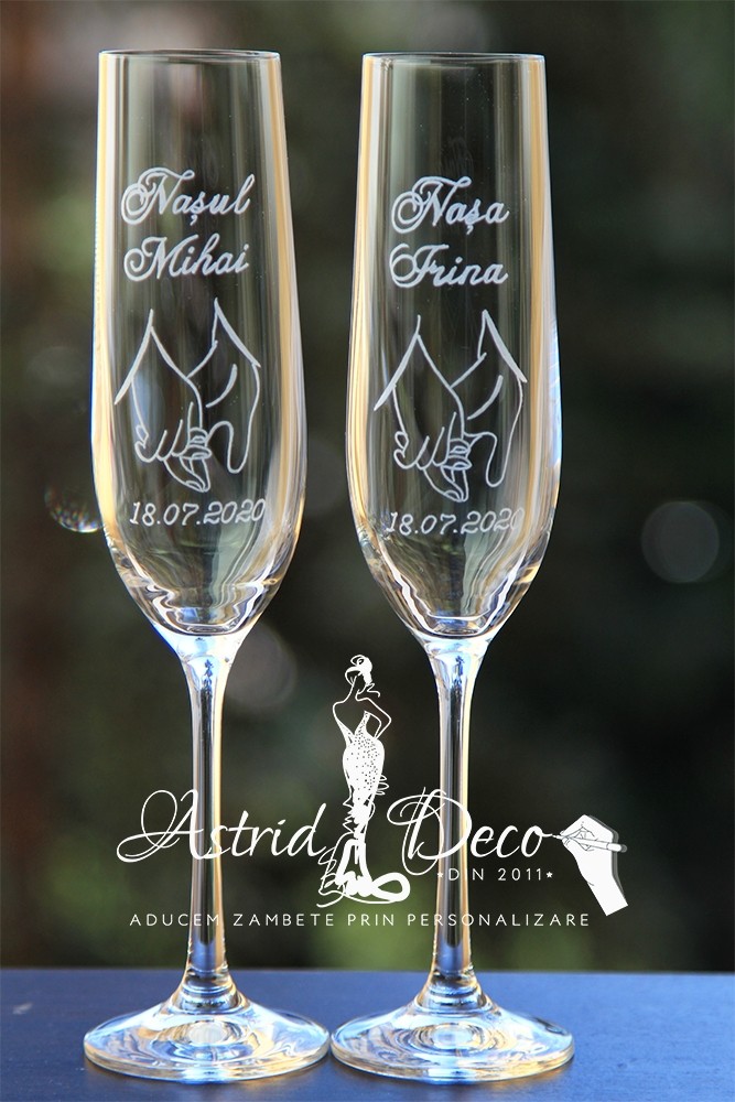 Set format din 2 pahare Bohemia de sampanie, gravate manual cu Nasa/ Nasul, model 2 maini, data nuntii