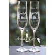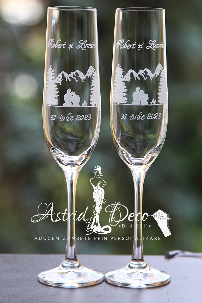 Set format din 2 pahare de sampanie, Bohemia, gravate manual cu model munti, brazi si siluete cuplu langa foc
