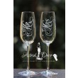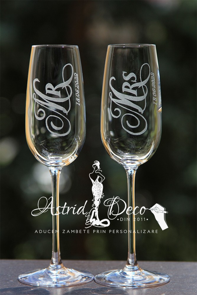Pahare de sampanie, gravate manual cu text pe verticala cu Mr / Mrs si data nuntii