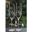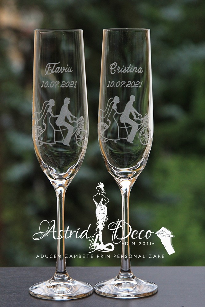 Set format din 2 pahare Bohemia de sampanie, pentru miri, gravate manual cu numele acestora, data nuntii si model miri pe bicicleta