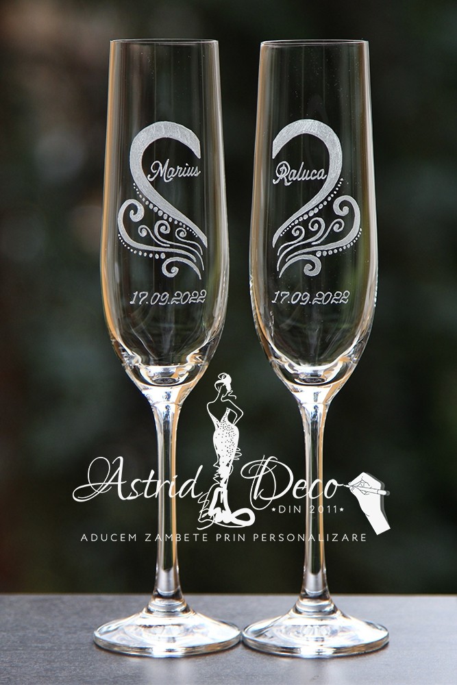 Set format din 2 Pahare Bohemia, de sampanie, gravate manual cu model de jumatate de inima pe fiecare pahar,
