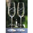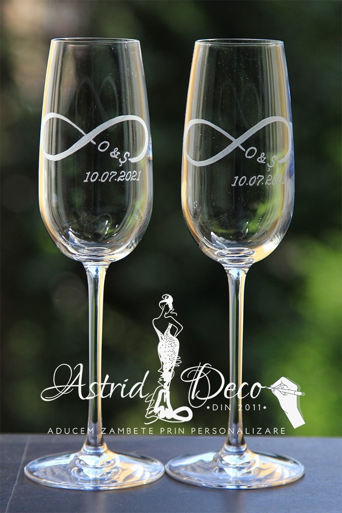 Pahare de sampanie, gravate manual cu model infinit, initialele mirilor si data nuntii.