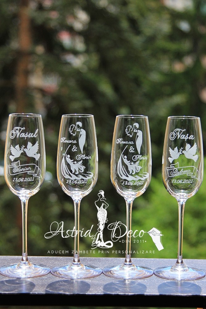 pahare nasi: Nasa/ Nasul, model 2 porumbei, panglica cu nume, data nuntii