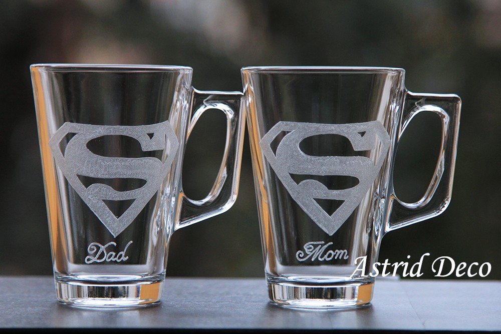 Set compus din 2 cani de sticla, gravate manual cu model S (de la Superman) si sub: Mom / Dad