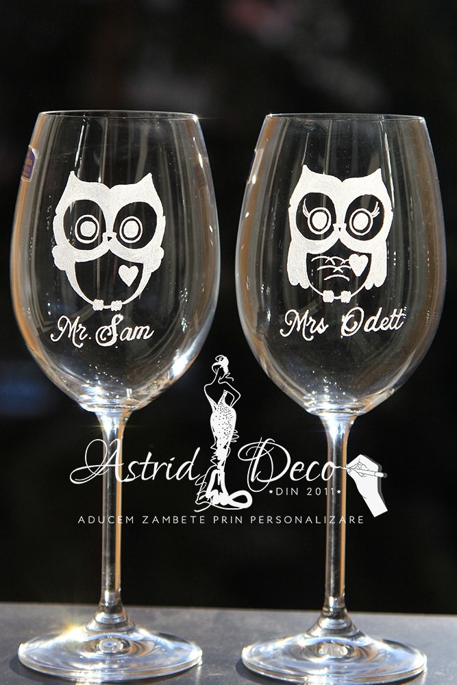 Set de 2 pahare Bohemia, de vin, gravate manual cu mdel bufnite si personalizate cu nume