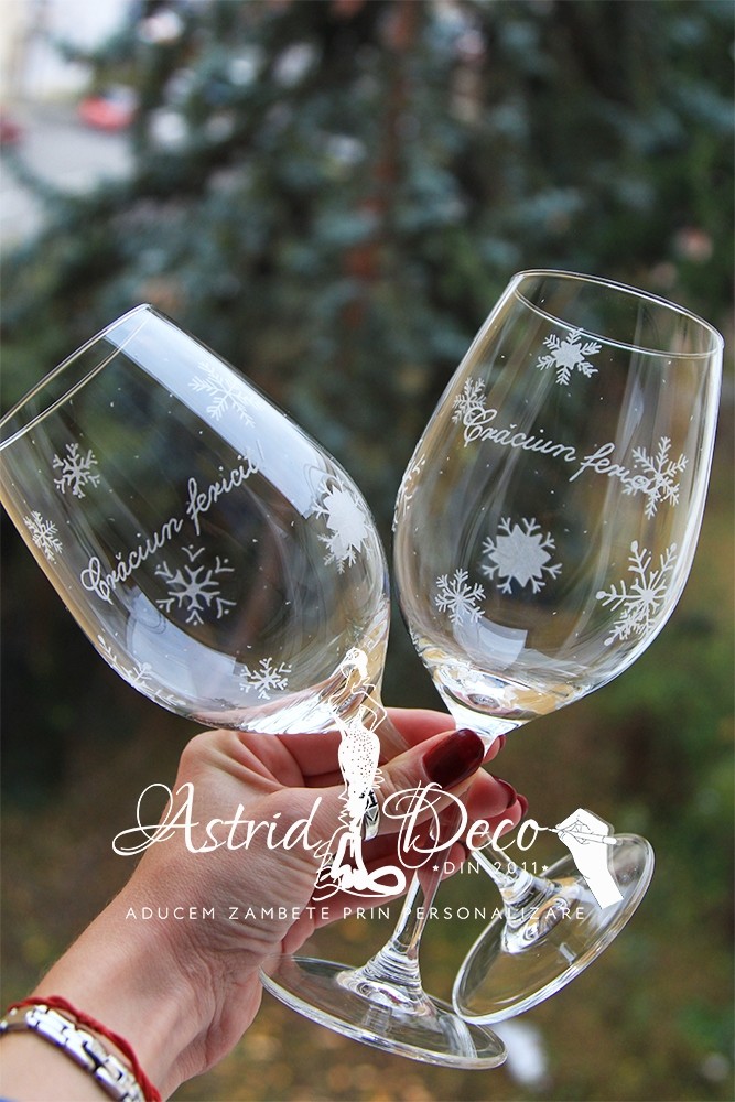 Set format din 2 pahare de vin, gravate manual cu mesajul "Craciun Fericit!" si model de fulgi de zapada de jur imprejur