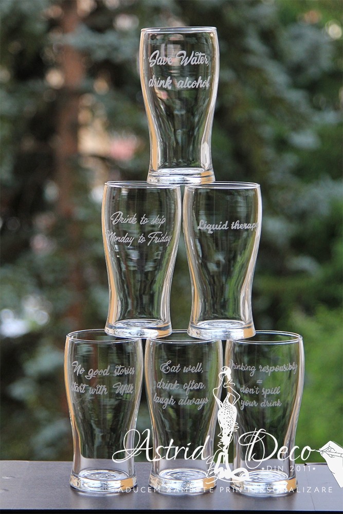 Set de 6 pahare de sticla, pentru bere, gravate manual fiecare cu cate un text: