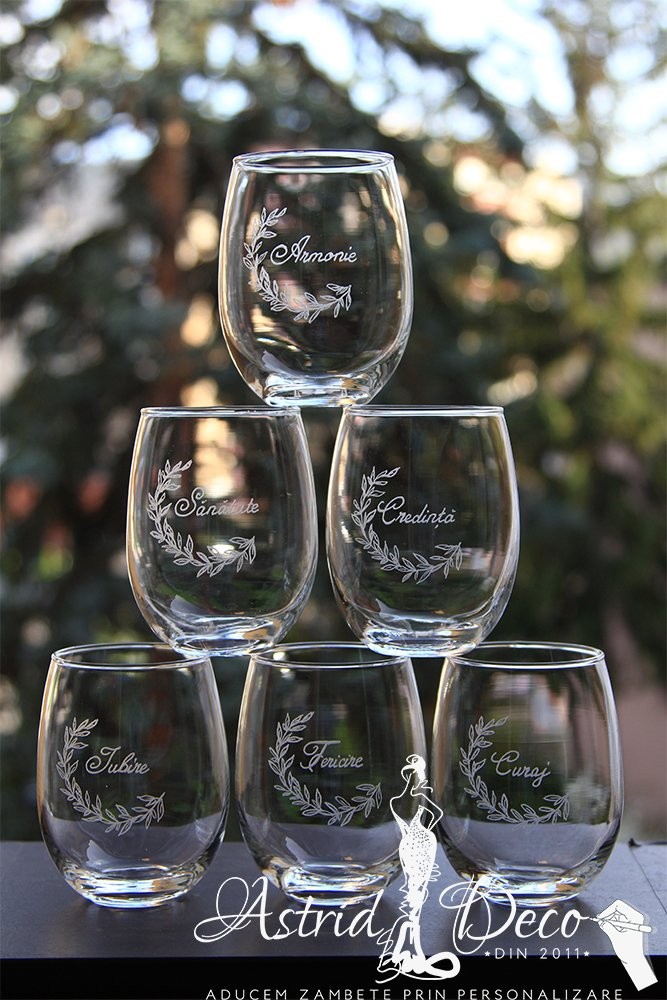Set format din 6 pahare gravate manual cu model crenguta si cuvinte.