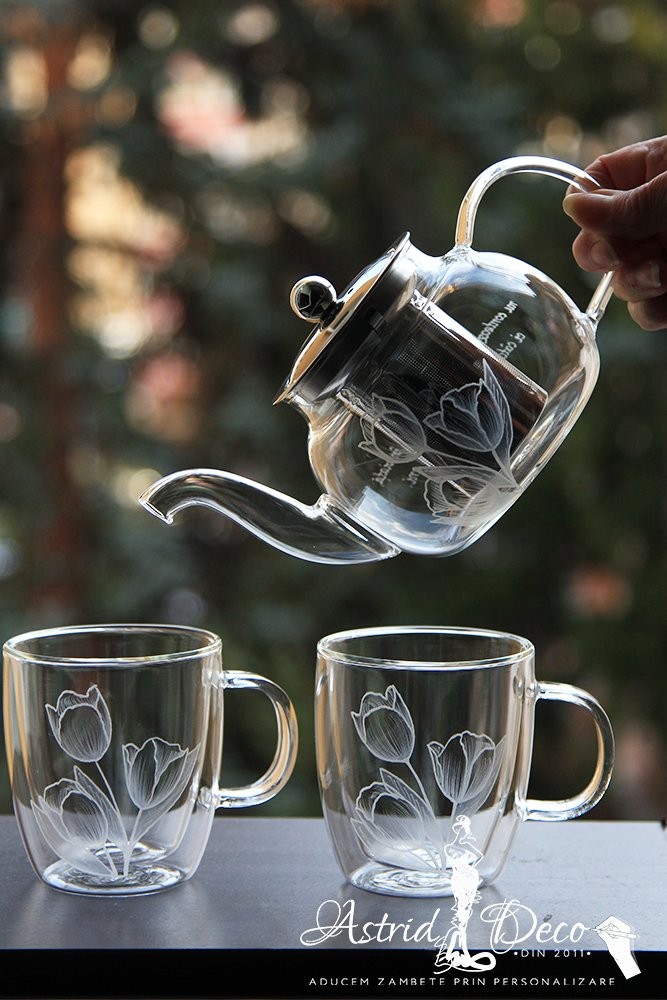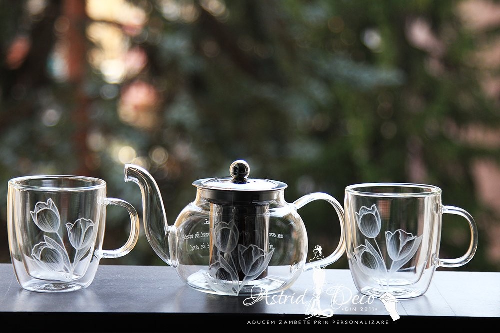 gravate toate cu model lalele, iar ceainicul personalizat si cu un mic text