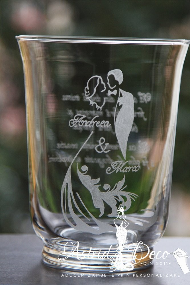 Vaza de sticla, gravata manual cu model siluete miri, numele acestora, data nuntii si mesaj personalizat.