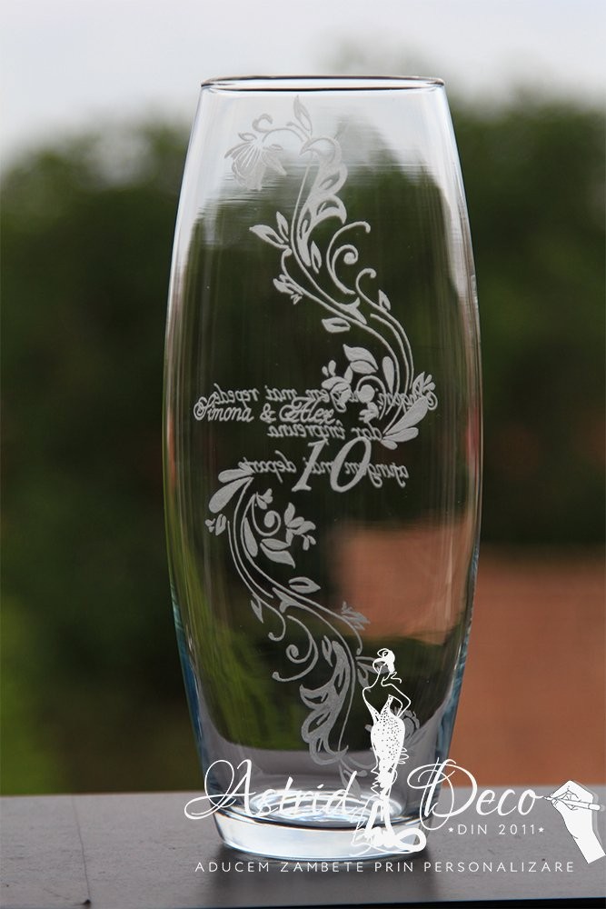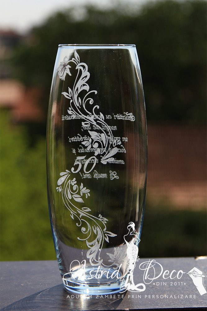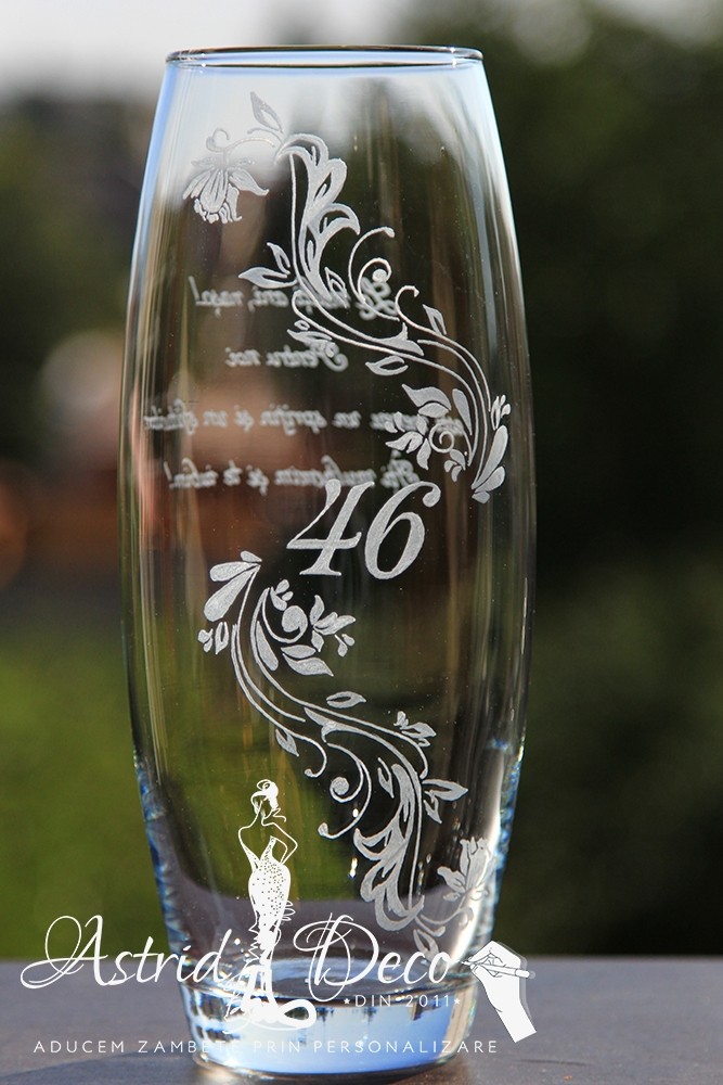 Vaza de sticla gravata manual cu model si cifra aniversarii