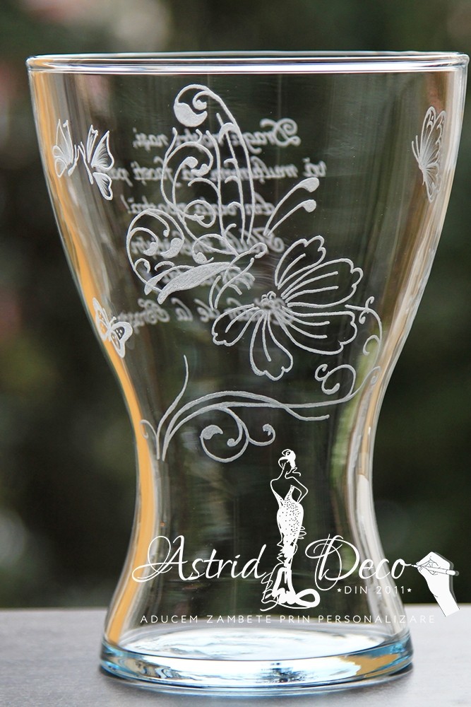 Vaza de sticla, gravata manual cu model Fluture pe floare si alti cativa fluturi pe langa