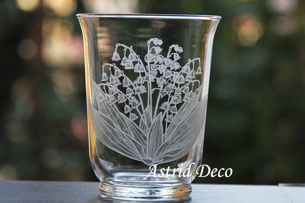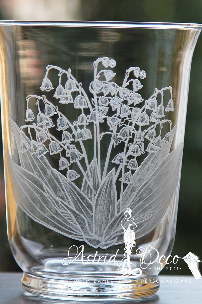 Vaza de sticla, gravata manual cu model Buchet de Lacramioare