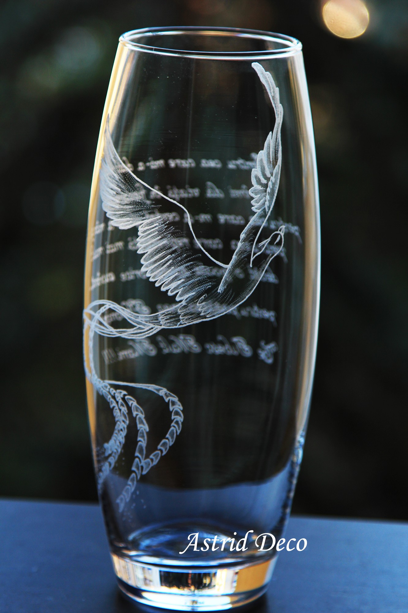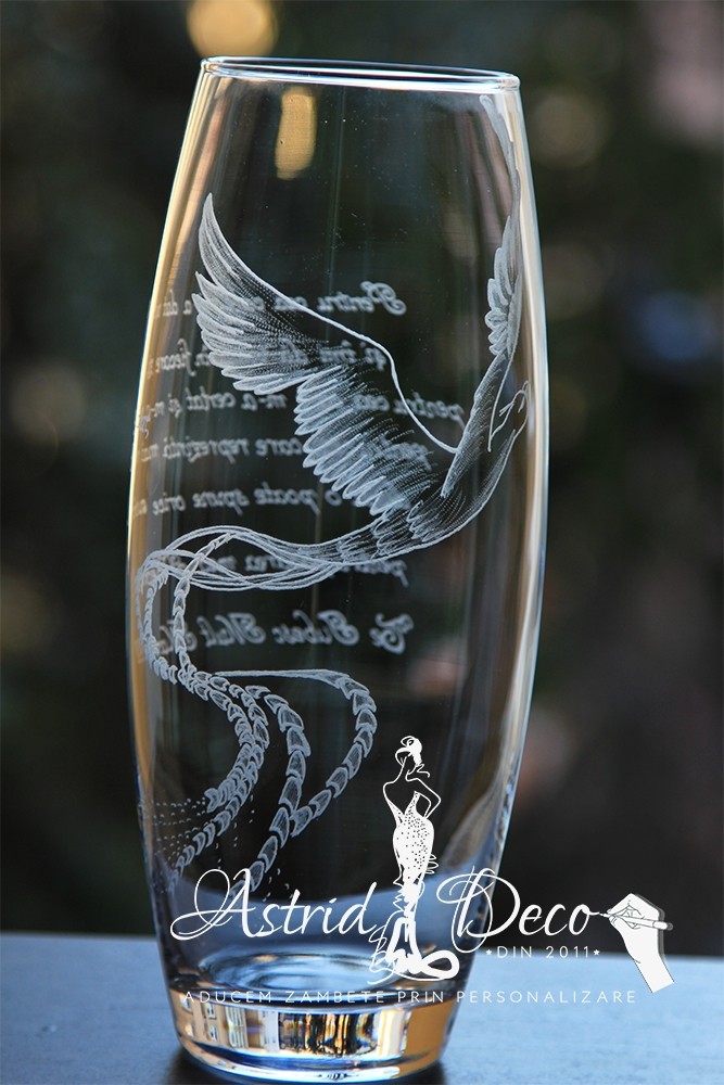 Vaza de sticla. gravata manual cu model pasarea Phoenix si text personalizat