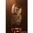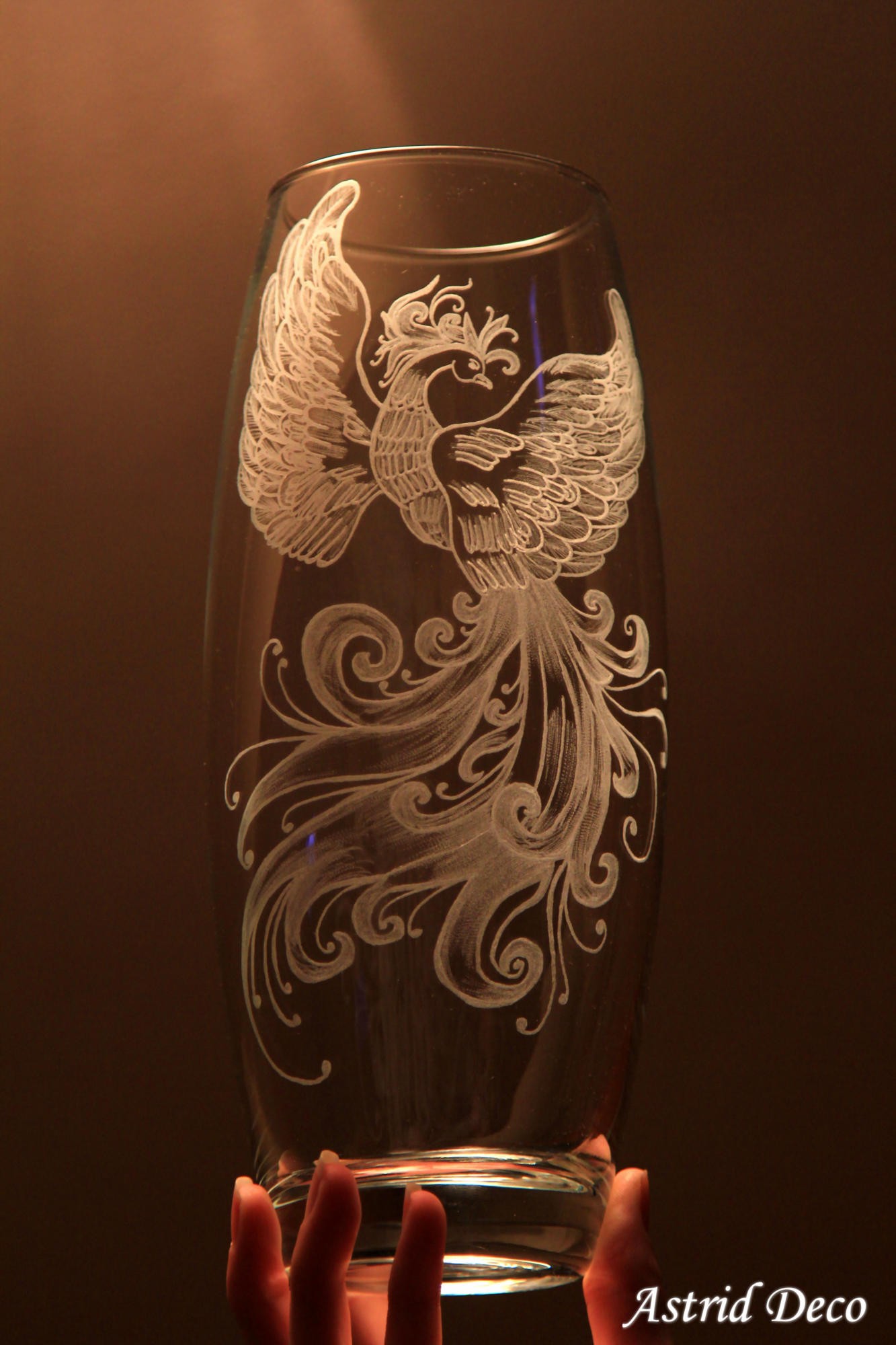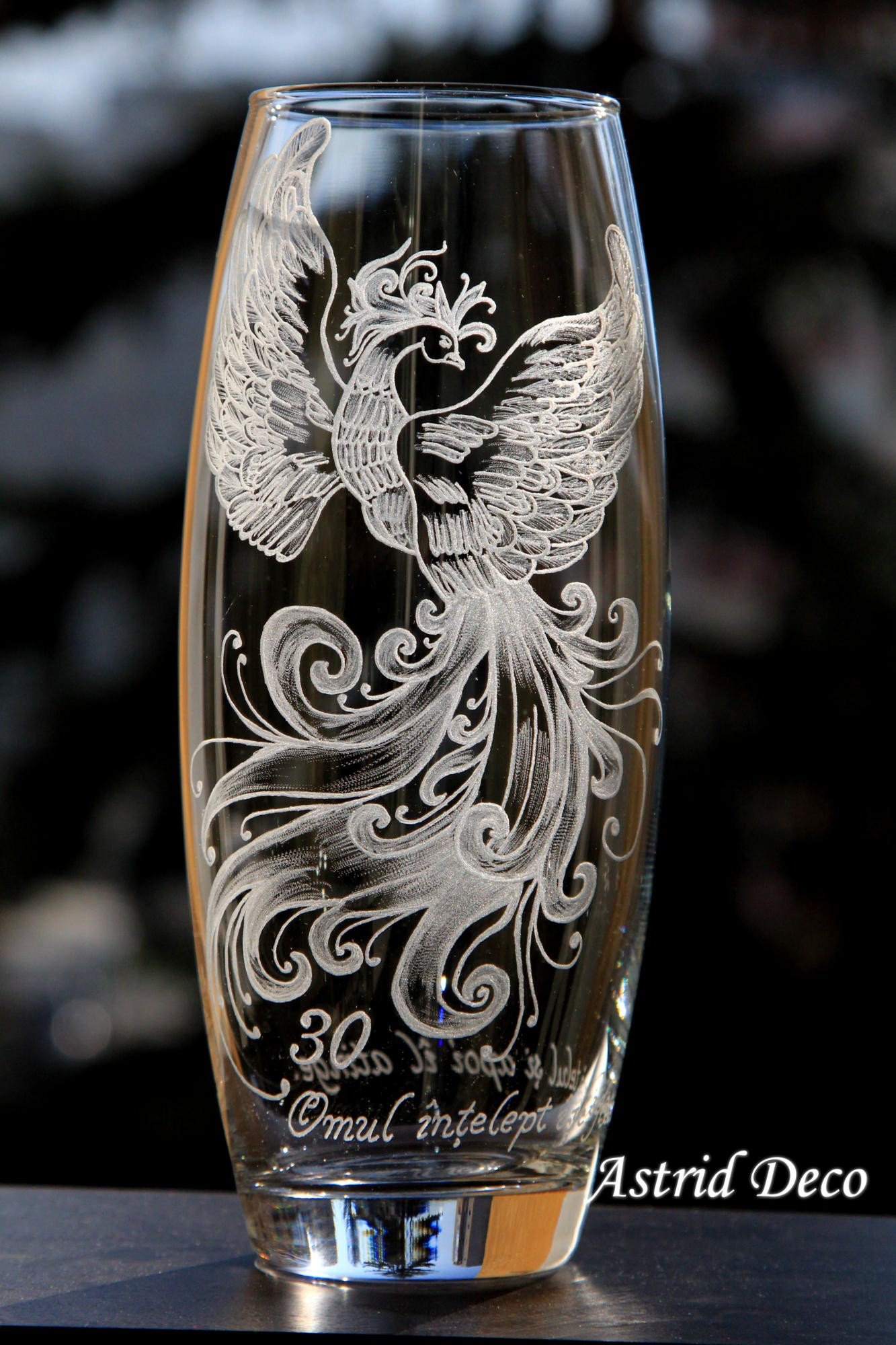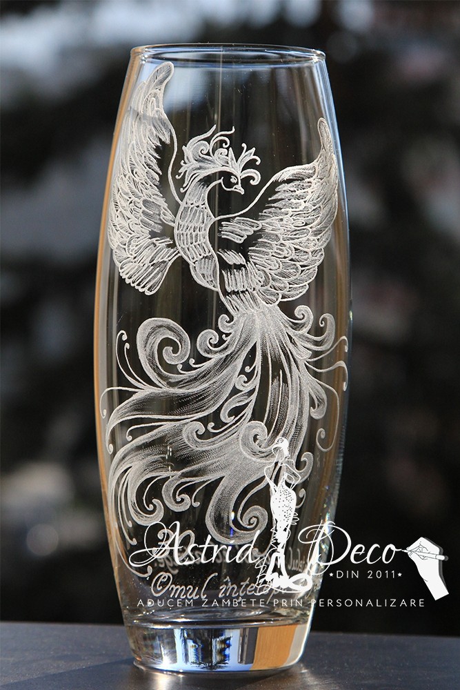 Vaza de sticla gravata manual cu model pasarea Phoenix